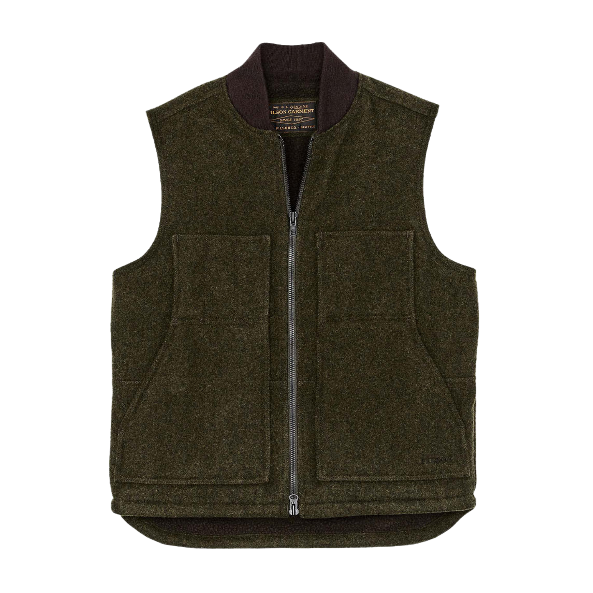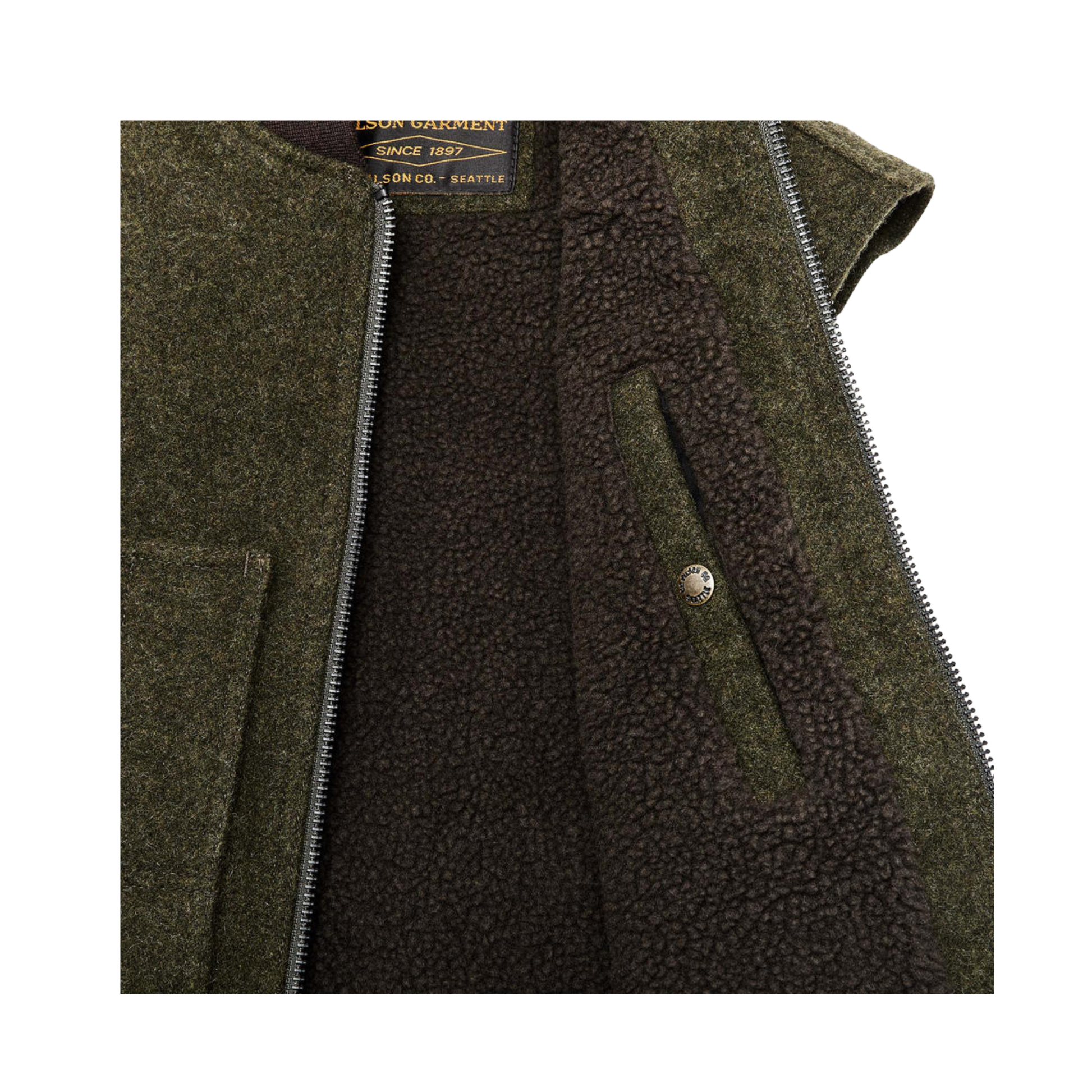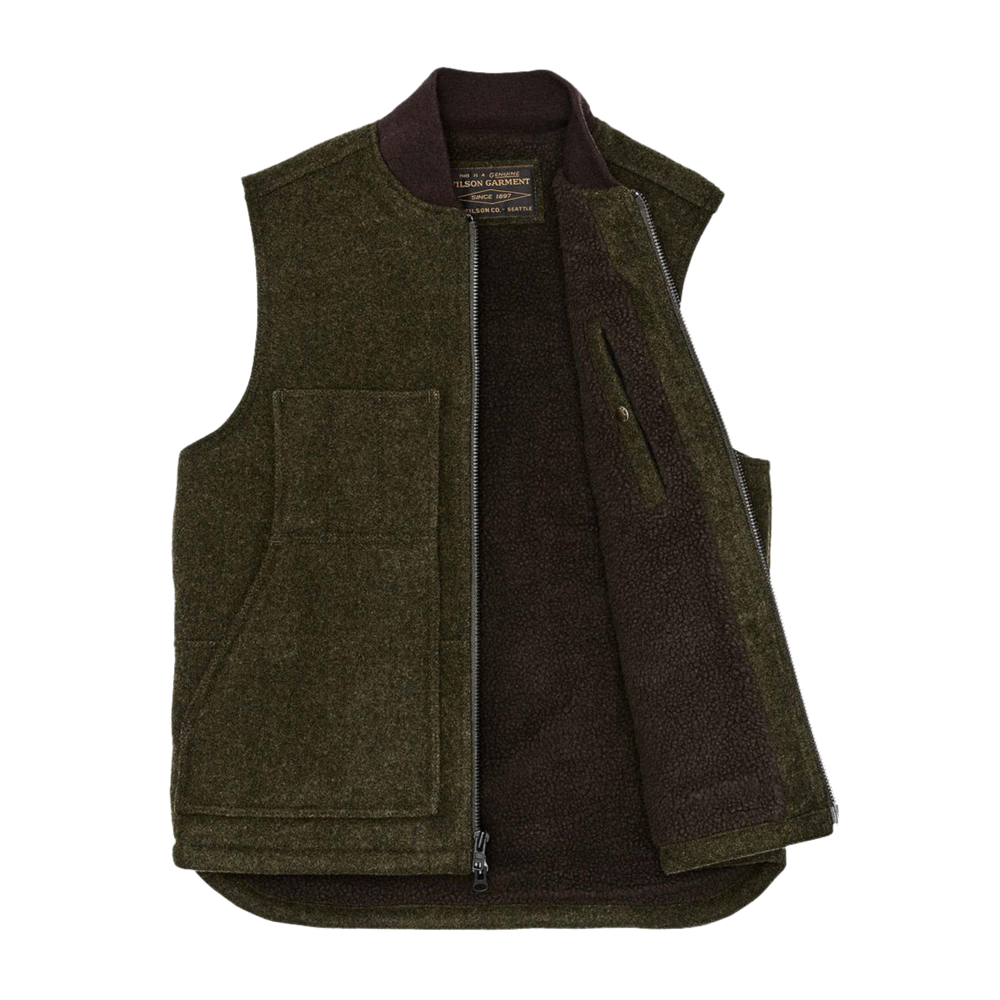 Die Lined Mackinaw Wool Arbeitsweste kombiniert kultige, strapazierfähige und wetterfeste Wolle mit hochflorigem Sherpa, das die wärmespeichernden Eigenschaften von Schafsfell nachahmt. Die wärmste und vielseitigste Weste auf dem Markt.