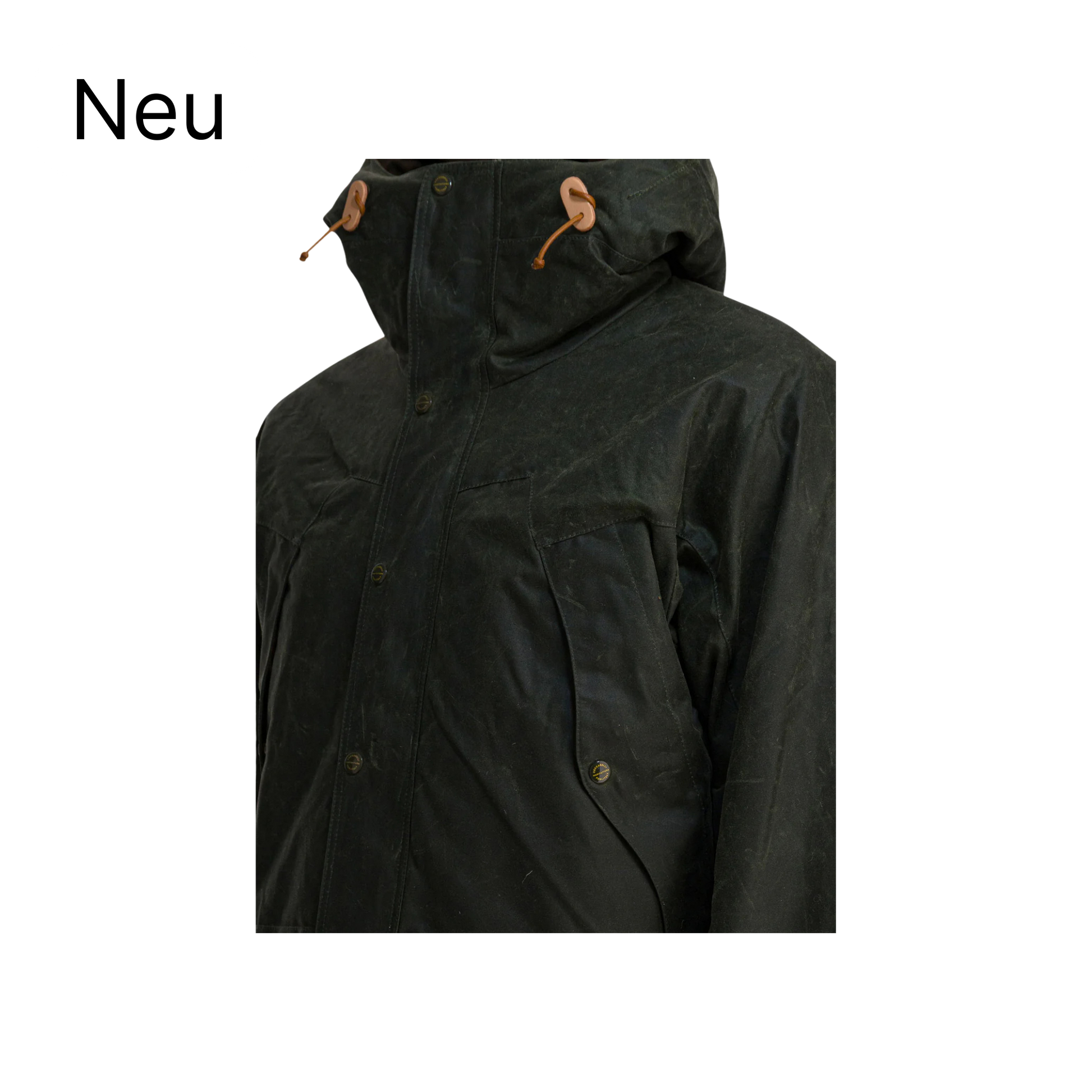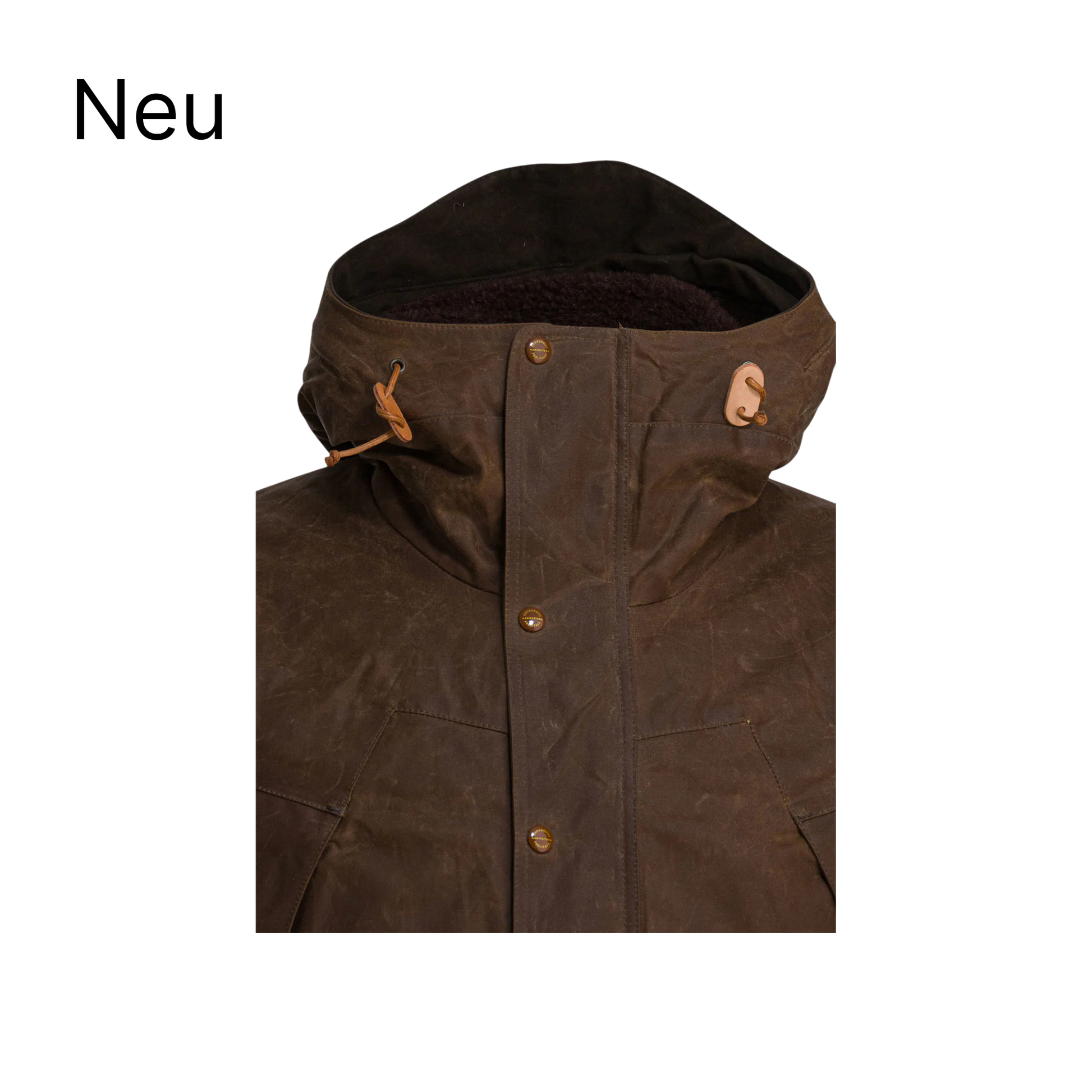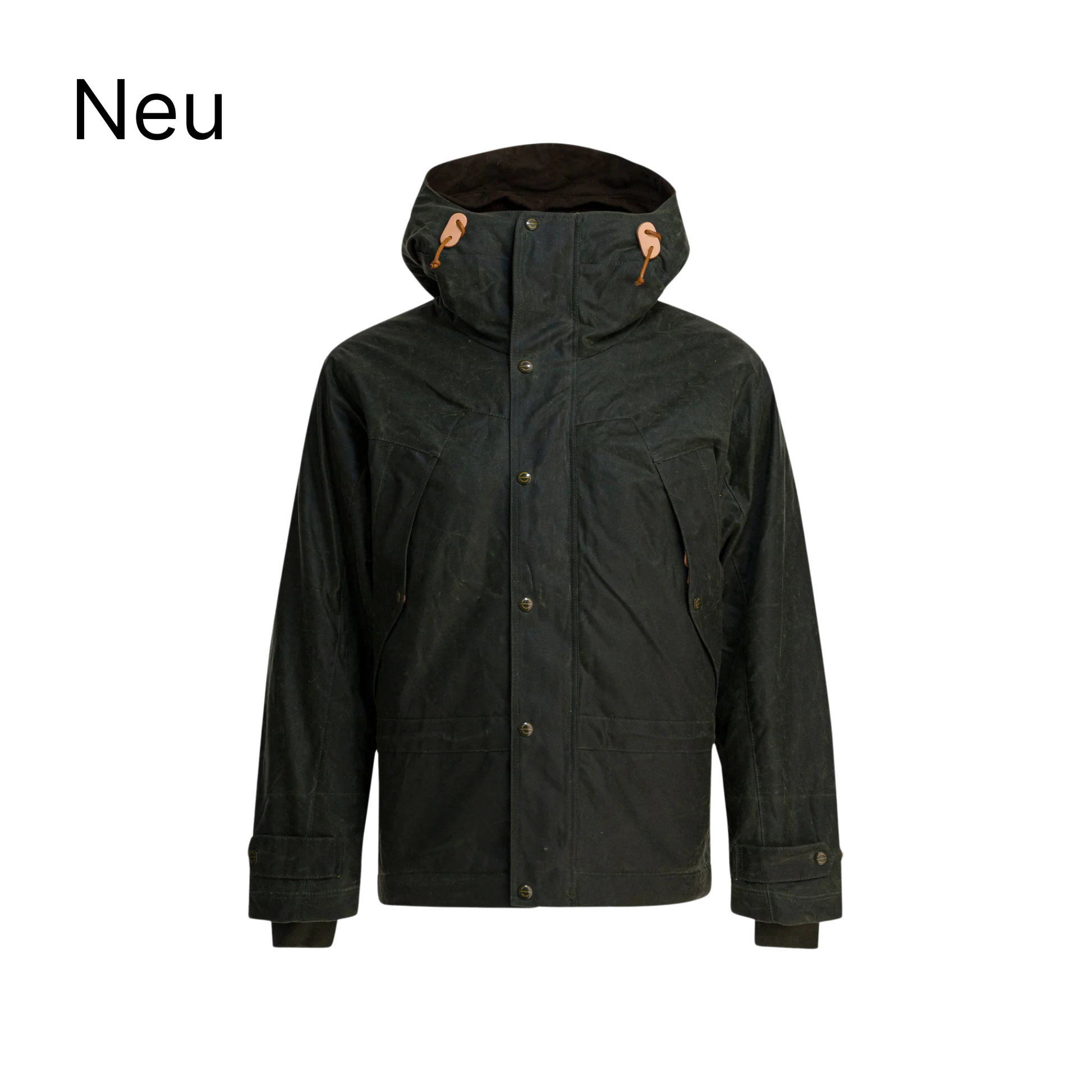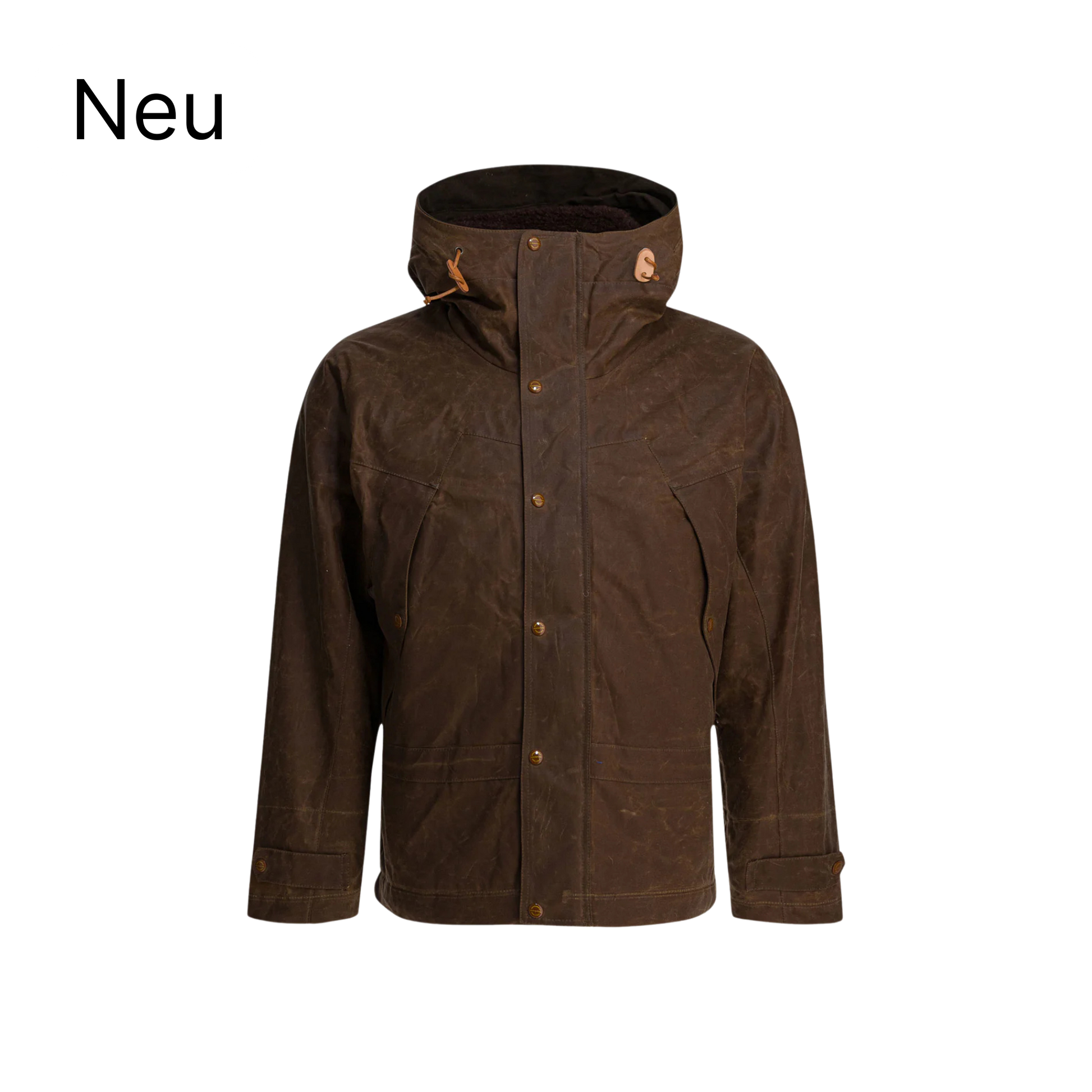 Diese Jacke aus wasserabweisendem, wachsbeschichtetem Gewebe zählt zu den historischen Modellen der Kollektion und verbindet Tradition mit moderner Funktionalität. Der Rumpf ist mit einem wärmenden Fleece-Wollfutter ausgestattet, die Ärmel sind mit feiner Wollwatte aus in Italien gezüchteten Schafen gepolstert. Für besonderen Tragekomfort sorgt die großzügige Kapuze, die innen mit einem weichen Wollteddy gefüttert ist und dank Lederriegel und elastischem Kordelzug individuell angepasst werden kann. Ein zusätzlicher elastischer Kordelzug am Hinterkopf ermöglicht auch mit aufgesetzter Kapuze eine klare seitliche Sicht.