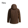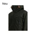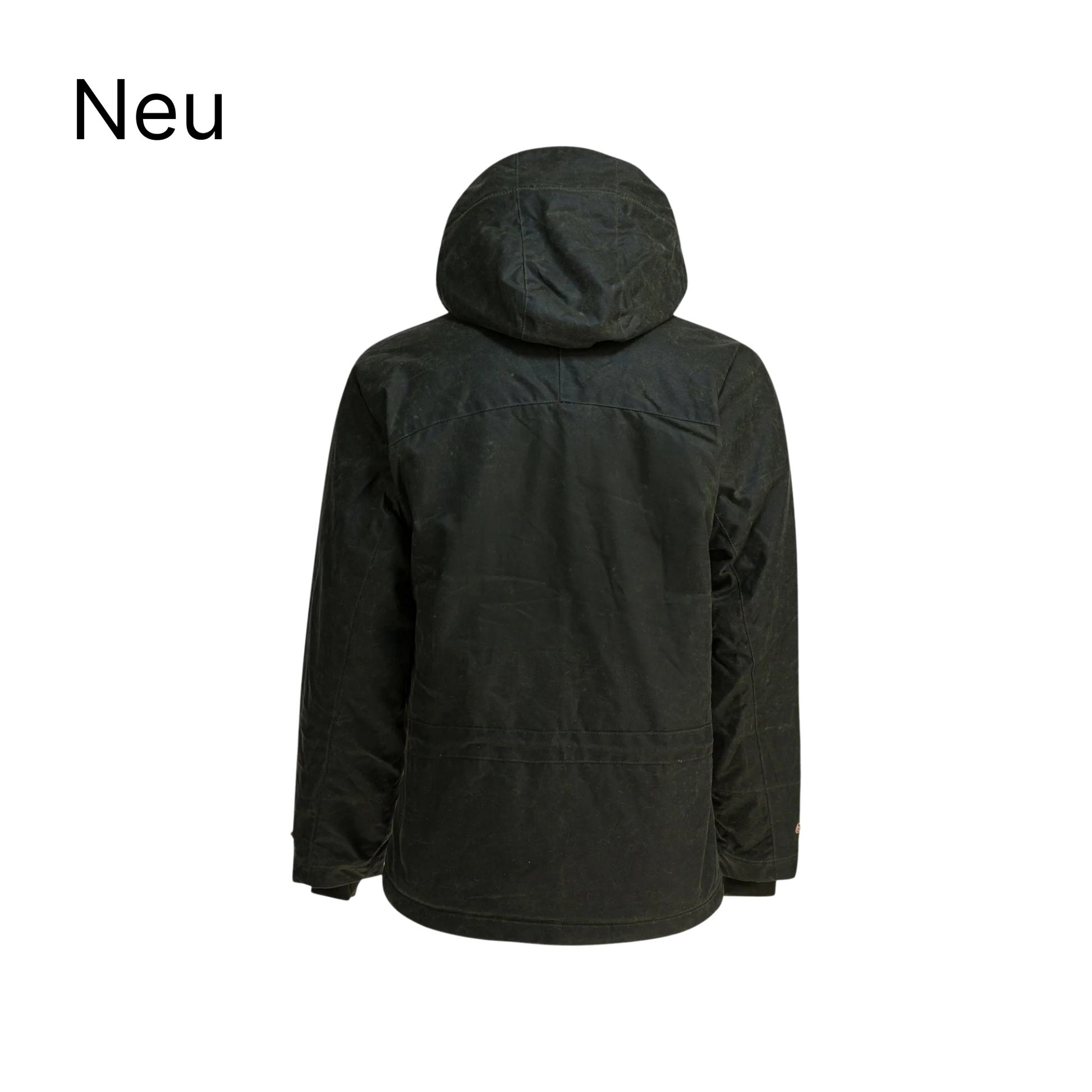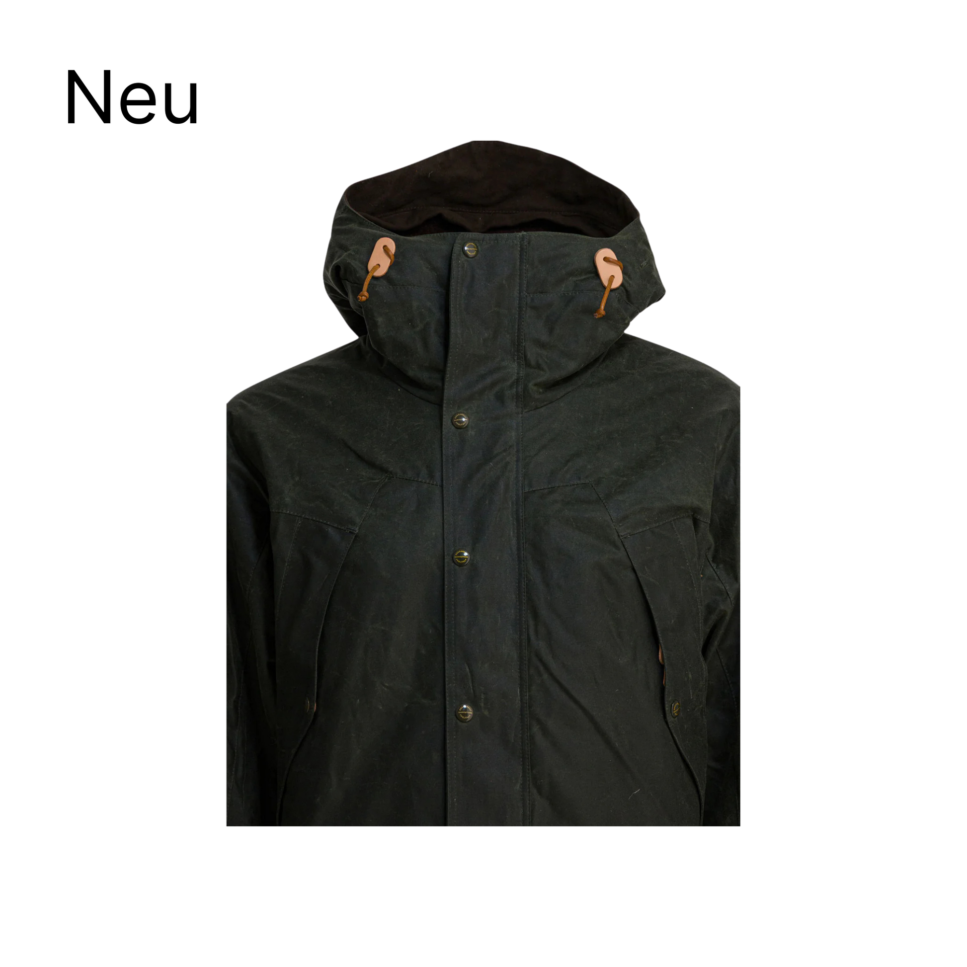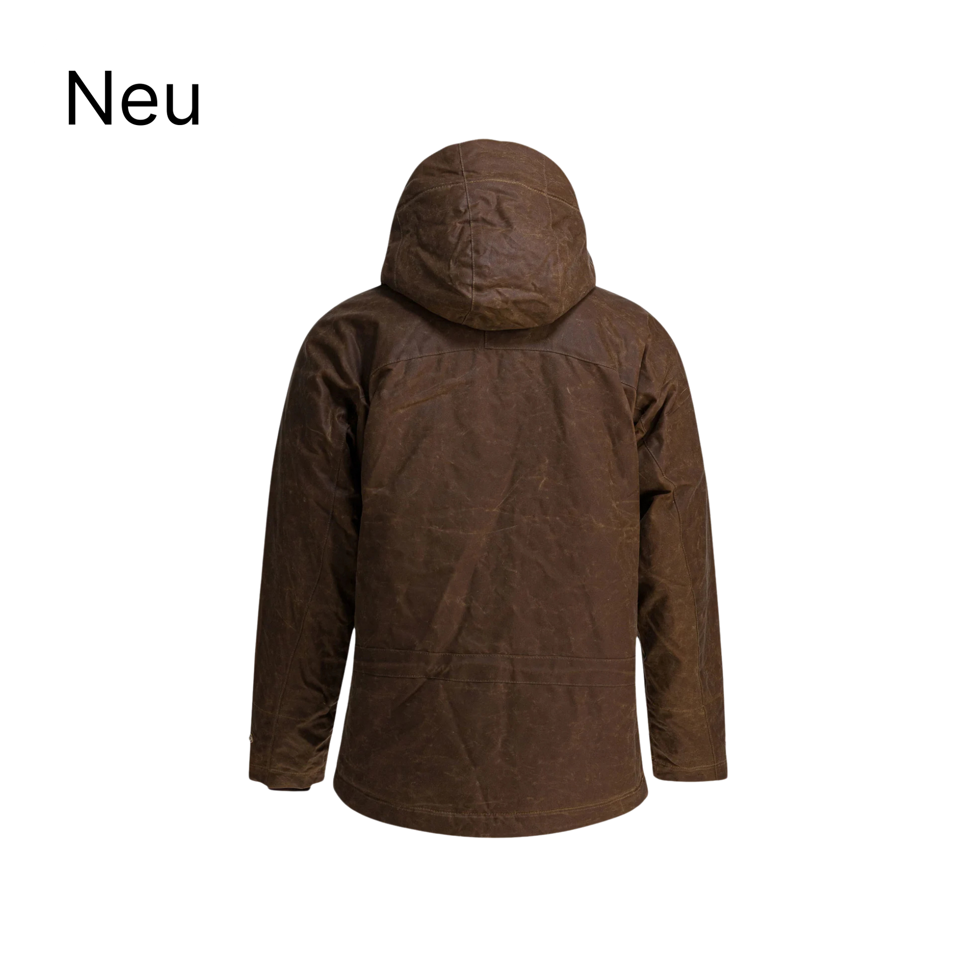Diese Jacke aus wasserabweisendem, wachsbeschichtetem Gewebe zählt zu den historischen Modellen der Kollektion und verbindet Tradition mit moderner Funktionalität. Der Rumpf ist mit einem wärmenden Fleece-Wollfutter ausgestattet, die Ärmel sind mit feiner Wollwatte aus in Italien gezüchteten Schafen gepolstert. Für besonderen Tragekomfort sorgt die großzügige Kapuze, die innen mit einem weichen Wollteddy gefüttert ist und dank Lederriegel und elastischem Kordelzug individuell angepasst werden kann. Ein zusätzlicher elastischer Kordelzug am Hinterkopf ermöglicht auch mit aufgesetzter Kapuze eine klare seitliche Sicht.
