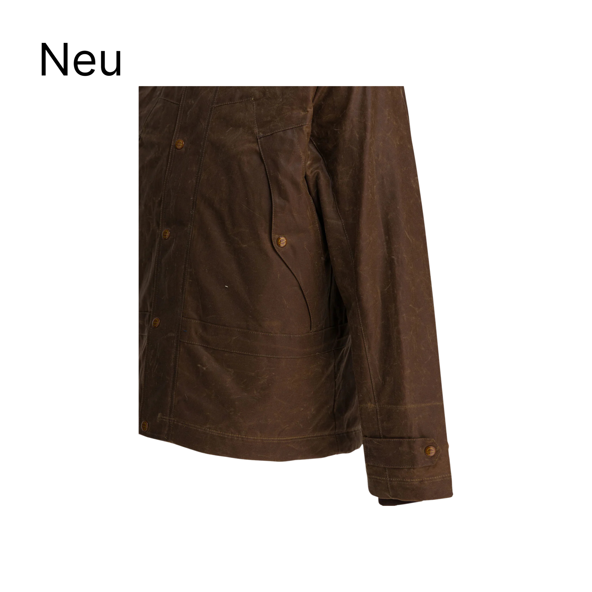 Besondere Liebe zum Detail zeigt sich in der Verarbeitung: Jeder Druckknopf ist mit Lederscheiben verstärkt, sämtliche Lederdetails bestehen aus pflanzlich gegerbtem Naturleder. Vernäht mit wasserabweisendem Spezialgarn und gefertigt mit Leidenschaft in Italien, ist diese Jacke ein stilvoller und funktionaler Begleiter, der Qualität und Handwerkskunst in sich vereint.