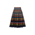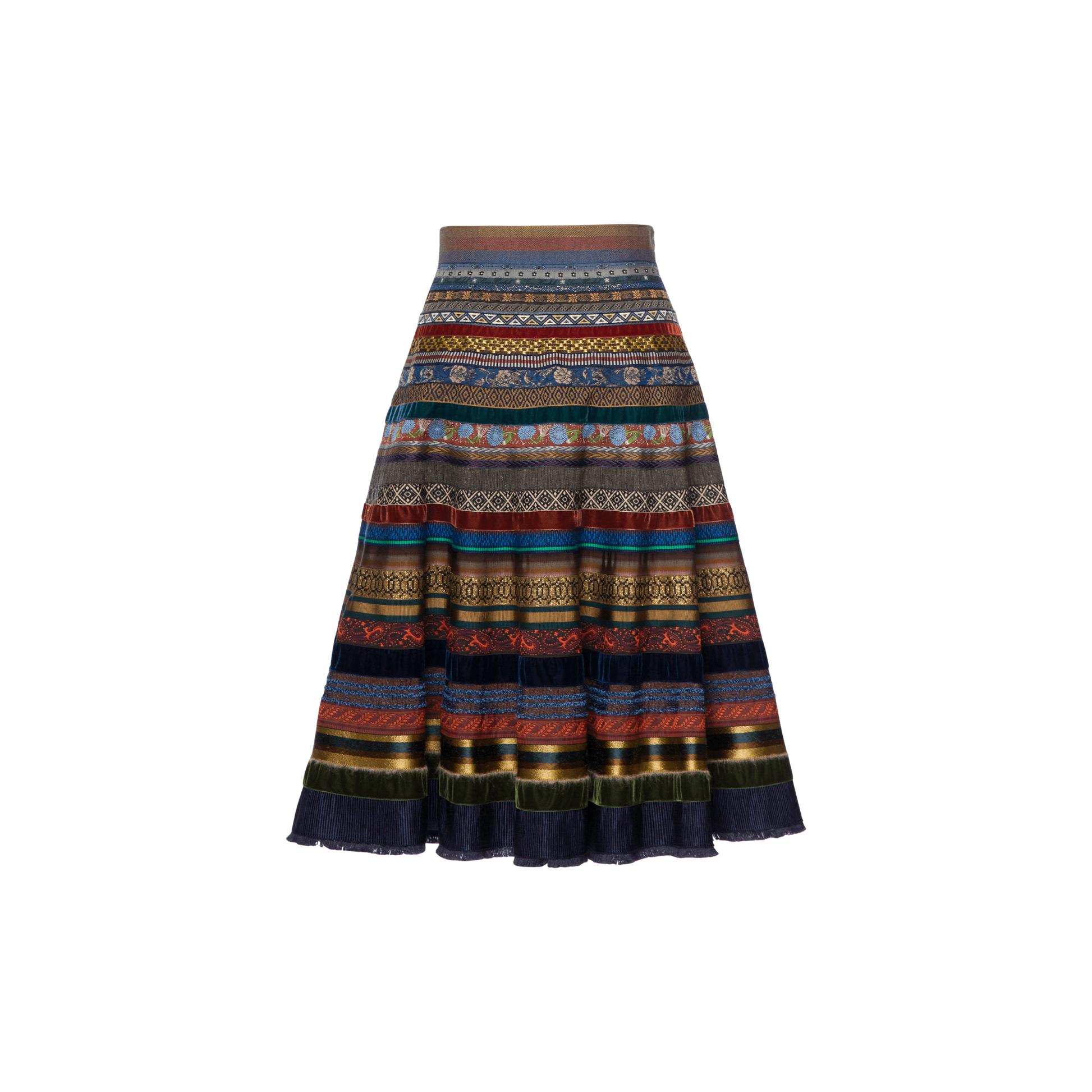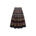 Der „Swing Ribbon“-Rock aus der Lena Hoschek Herbst/Winter 2025 Kollektion ist ein traditioneller Bänderrock mit klassischen Bänder-Verzierungen, einem breiten, mehrfarbigen Bund und einem Fransenabschluss. Voller Bewegung und Bedeutung.