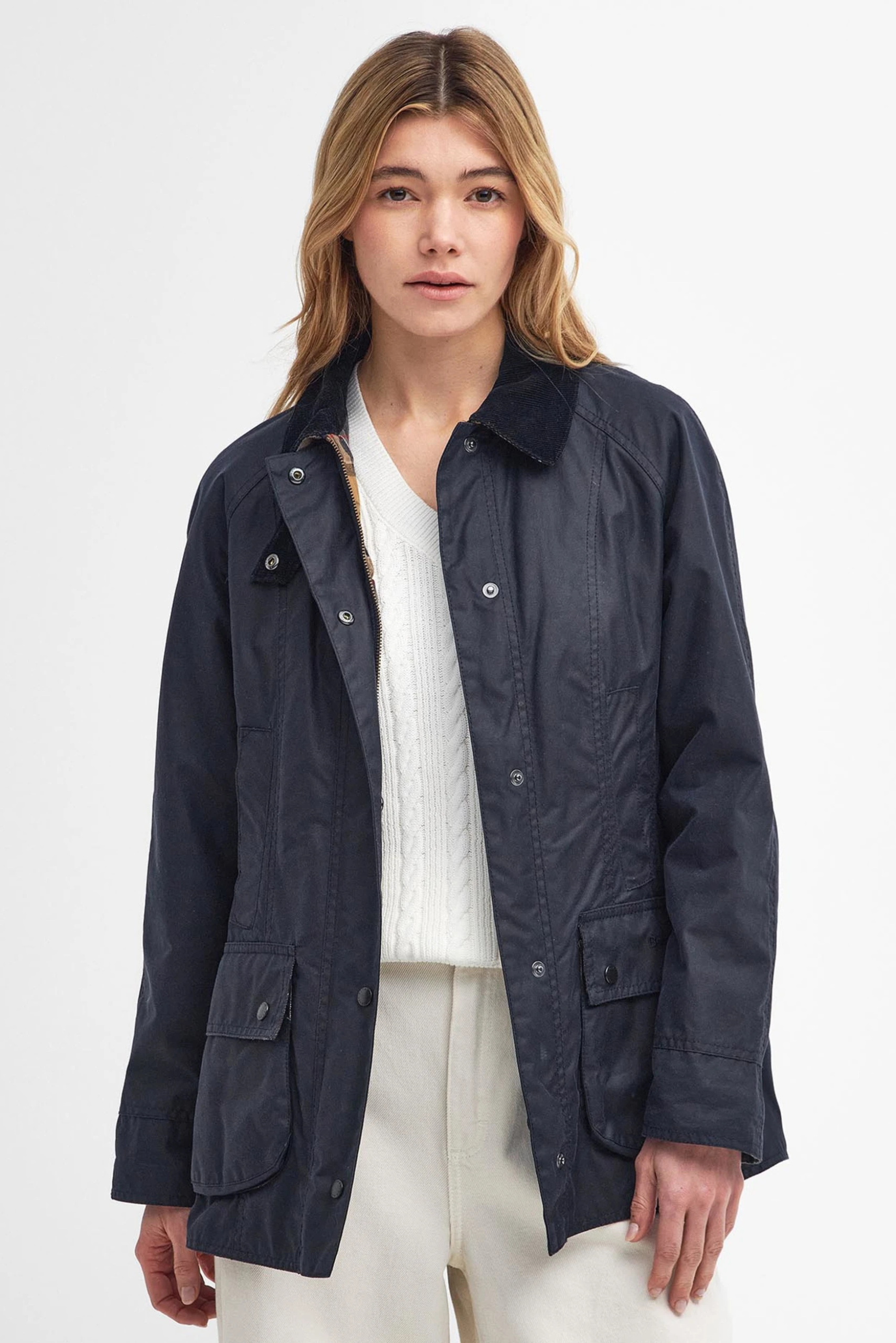 Die Damenjacke Beadnell ist aus gewachster Baumwolle in strapazierfähiger 6oz-Qualität gefertigt und verfügt über ein komfortables Innenfutter aus Baumwolle. Das Design der wind- und wasserabweisenden Damenjacke basiert auf dem legendären Herren-Modell Bedale und knüpft an die Erfolgsgeschichte des legendären Klassikers an. Charakteristische Details wie der Cordkragen, Schubtaschen, zwei großzügige Blasebalgtaschen und der praktische 2-Wege-Reißverschluss verleihen der zeitlosen Outdoorjacke für Damen die unverwechselbare Optik einer klassischen Barbour-Jacke. Die Jacke kann durch ein wärmendes Innenfutter und eine Kapuze ergänzt werden.
