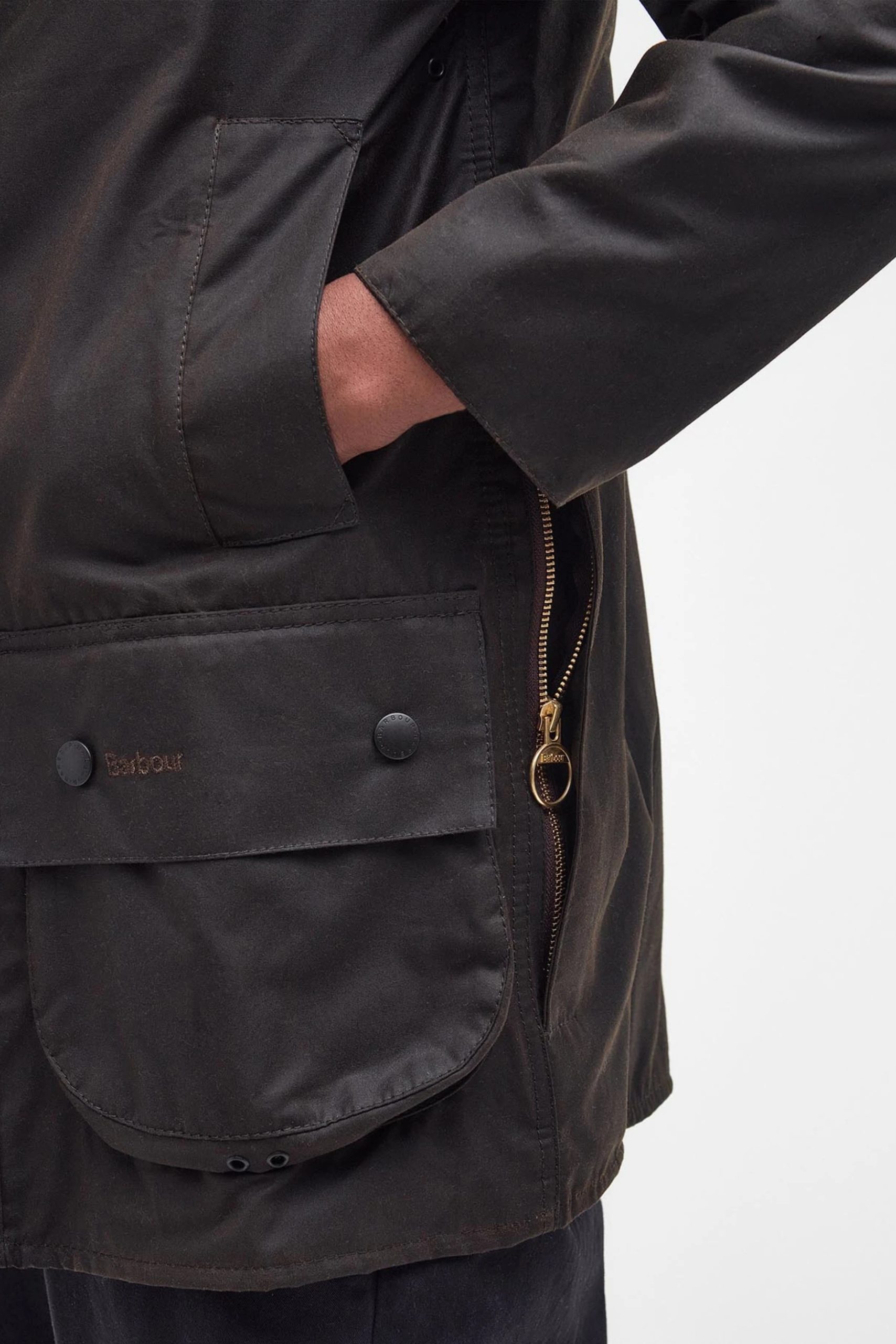 Die etwas länger geschnittene Wachsjacke Beaufort lässt sich bequem über einem Sakko tragen. Charakteristische Details wie der anschmiegsame Cordkragen, ein robuster 2-Wege-Reißverschluss sowie praktische Schubtaschen verleihen der wetterbeständigen Wachsjacke einen unverwechselbar klassischen Look. Kennzeichnend für die Jacke sind eine Reißverschlusstasche auf der Rückseite, eine leicht zugängliche Reißverschlusstasche unter der Windblende und das Baumwollfutter mit Tartan-Muster. Die Ärmelenden verfügen an der Innenseite über einen Einsatz aus Polyester, der mit einem Klettverschluss verstellbar ist und vor eindringender Nässe schützt. Noch heute wird die aus gewachster Baumwolle gefertigte Jacke in der hauseigenen Produktionsstätte in South Shields, im Nordosten Englands, gefertigt. Die Jacke kann durch ein wärmendes Innenfutter und eine Kapuze ergänzt werden.