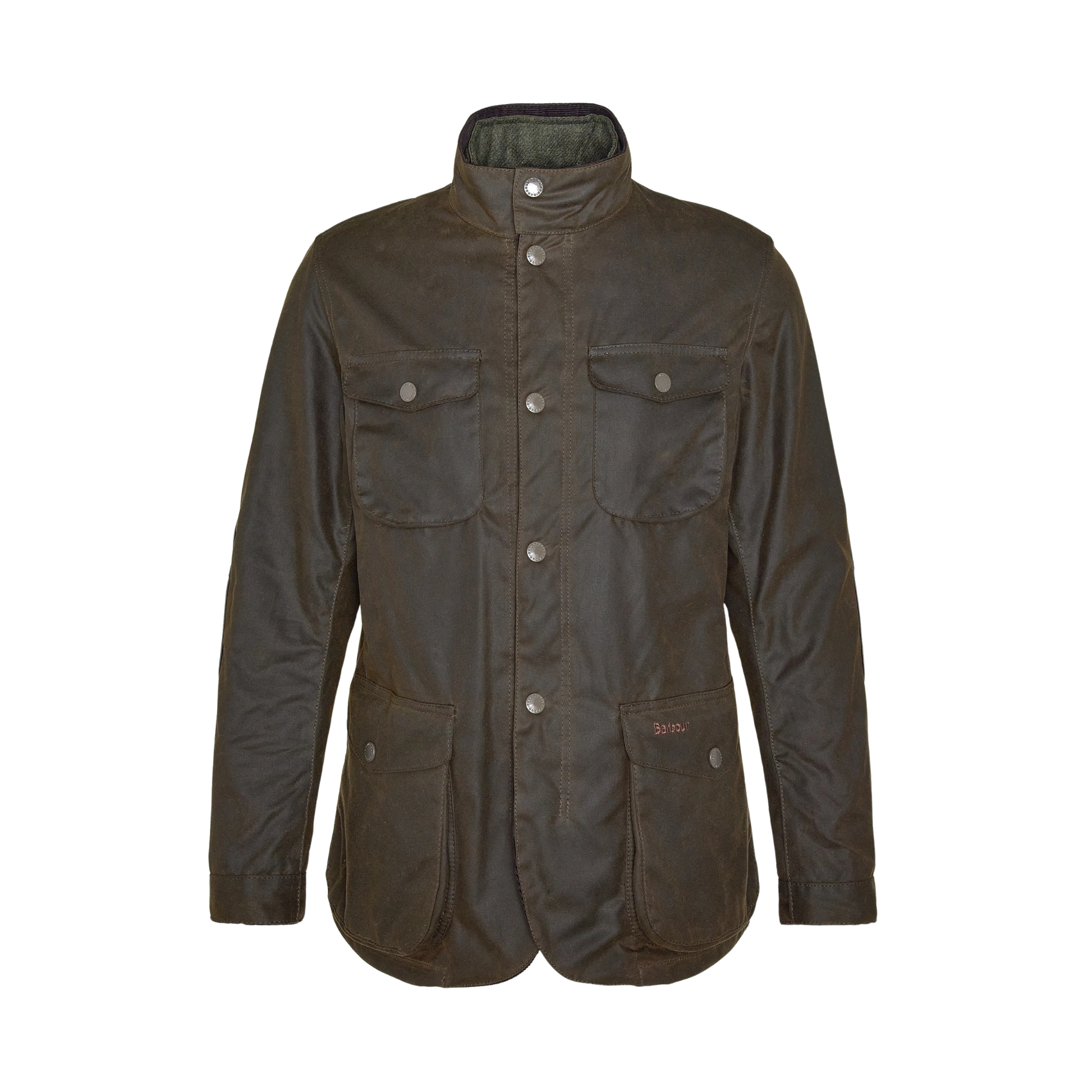 Die Wachsjacke Ogston präsentiert sich elegant, stilvoll und maskulin. Das komfortabel geschnittene Design wird aus robuster, gewachster Baumwolle (Oban) gefertigt und schützt mit seinem raulederähnlichen matten Finish perfekt vor schlechtem Wetter. Die integrierte Steppweste mit Stehkragen und einem Reißverschluss mit Logodruck bietet zusätzliche Wärme und sorgt für einen stilechten Outdoor-Look. Zur praktischen Ausstattung der Außenjacke gehören robuste Druckknopfverschlüsse, geräumige Taschen und markante Details wie Ellenbogen-Patches aus Leder mit Cordbesatz. Die Blasebalgtaschen und Schubtaschen bieten einen besonders großen Stauraum für alltägliche Gegenstände. Das Futter aus edlem Wollmix verleiht dem robusten Wintermodell eine elegante, raffinierte Note.