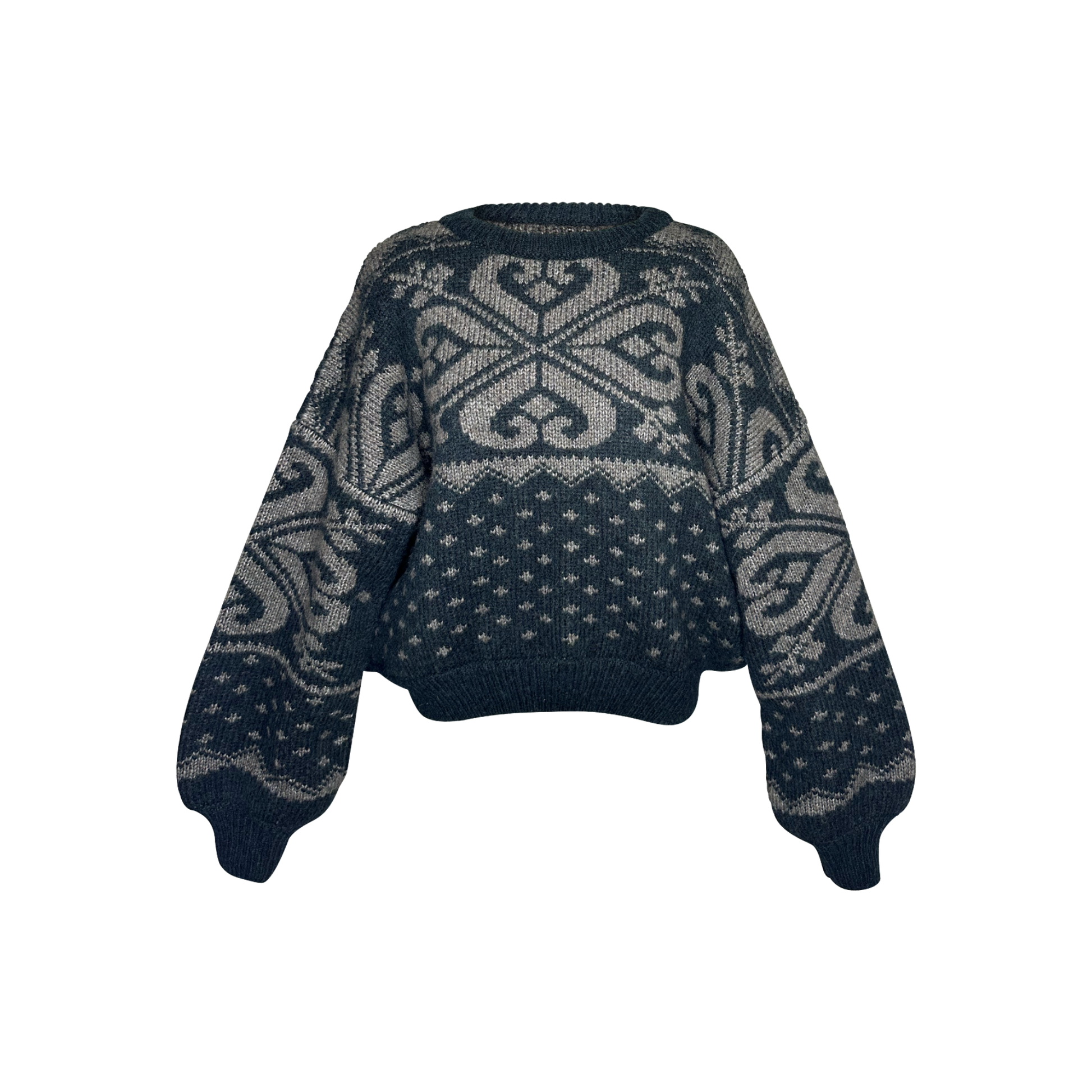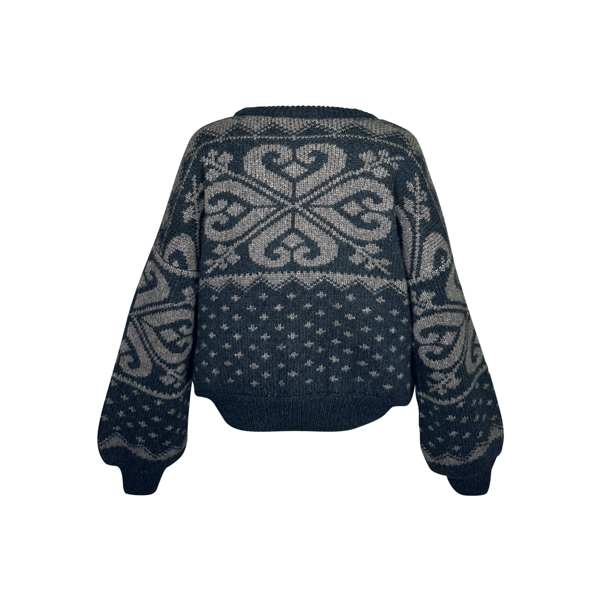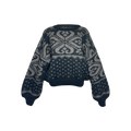 Der „Winnie“-Pullover von Lena Hoschek besteht aus einer hochwertigen Mischung aus Merinowolle und Polyamid und ist weich sowie angenehm zu tragen. Der weite Schnitt und die großzügigen Ärmel sorgen für eine lässige Passform, während die Rippbündchen und die betonte Taille dem Pullover eine strukturierte Silhouette verleihen. Der graue Pullover mit stilvollem Muster verleiht dem Look zusätzlich Eleganz und Individualität.